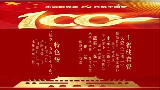 為慶祝中國(guó)共產(chǎn)黨成立100周年,進(jìn)一步展現(xiàn)黨的豐功偉績(jī)和公司企業(yè)文化,7月1日,公司食堂精心布置,推出特色套餐,與全體員工分享黨百歲生日的喜悅與甜蜜,共同祝福偉大的黨帶領(lǐng)中國(guó)人民邁進(jìn)新征程、奮進(jìn)新時(shí)代。