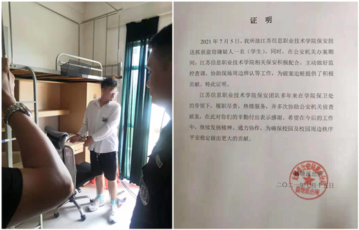 7月5日,公司派駐江蘇信息職業(yè)技術(shù)學(xué)院保安班經(jīng)過周密部署,抓獲一名盜竊嫌疑人并移交公安機(jī)關(guān)處置。在公安機(jī)關(guān)審查過程中,保安班積極配合,主動(dòng)做好監(jiān)控查調(diào)、現(xiàn)場(chǎng)周邊辨認(rèn)等工作,為破案追贓作出了積極貢獻(xiàn)。保安班組多年來(lái)秉承公司“忠誠(chéng)履職、優(yōu)質(zhì)服務(wù)”的理念做好校園安保工作,多次協(xié)助公安機(jī)關(guān)偵查破案,為營(yíng)造平安有序和諧穩(wěn)定的校園環(huán)境提供了有力保障,獲得了公安機(jī)關(guān)和校方的充分肯定和贊譽(yù)。