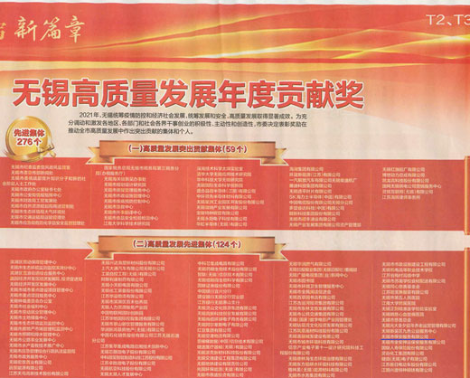 公司榮獲無錫市“2021年度高質(zhì)量發(fā)展先進(jìn)集體”稱號(hào)
