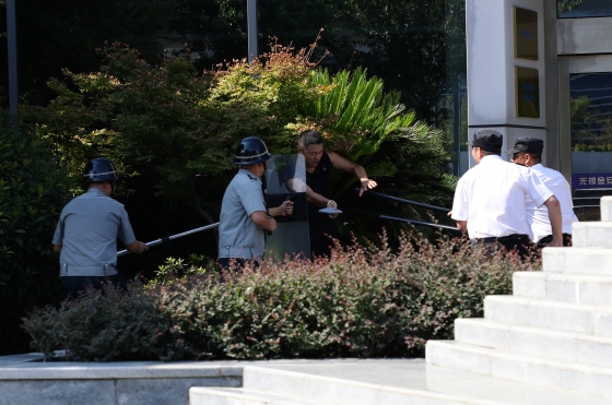 “請出示有效證件!”南大門崗?fù)ぬ?,門衛(wèi)例行開展身份核驗時,一名男子不僅拒不配合,反而情緒激動推搡門衛(wèi),企圖強行闖入基地。危機時刻,保安組立即啟動應(yīng)急響應(yīng):南大門快速關(guān)閉落鎖,一名保安同步向監(jiān)控中心實時匯報險情,其余隊員手持防暴叉迅速形成包圍攔截陣型。見攔截受阻,男子突然從懷中抽出“匕首”揮砍反抗與保安陷入對峙。接到指令的值班人員火速馳援,憑借默契配合形成攻防合力將“侵入者”成功制服并控制。隨后,現(xiàn)場按流程聯(lián)系警方移交處置,整個過程反應(yīng)迅速、操作規(guī)范、銜接無縫。
